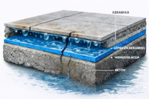Alkalije iz betona i lepka za keramiku postepeno degradiraju polimer-cementne slojeve, posebno oko slivnika i spojeva — baš tamo gde je opterećenje najveće.
