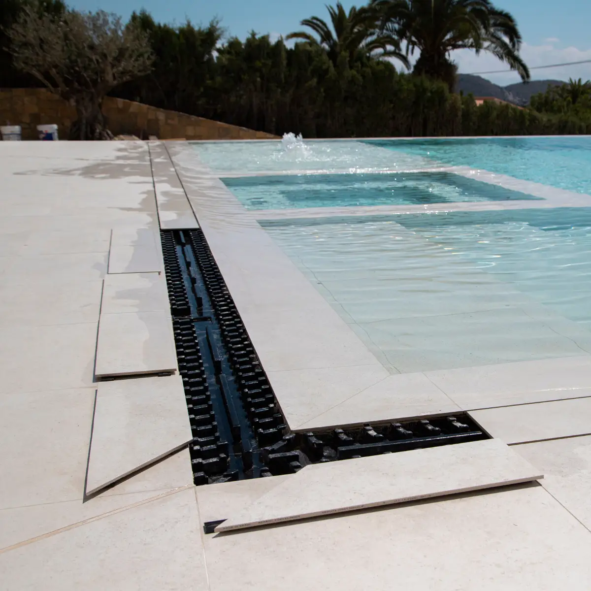 WALK LEVEL je patentirani, potpuno nevidljivi sistem odvoda za terase i bazene – jedino rešenje na tržištu sa fabrički rešenim spajanjem na hidroizolaciju (preinstalirana membrana na flanši). Voda nestaje kroz fuge širine samo 4 mm, dok završna površina ostaje potpuno ravna i elegantna. Sistem se uklapa u sve obloge – keramiku, kamen ili deking – bez ikakvih vidljivih rešetki.